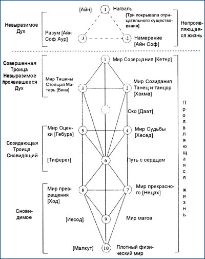 Читатели, знакомые с учением Каббалы, уже узнали в схеме десятикомпонентного строения человека и Вселенной десять сефирот«Оз Хиим» — «Древа Жизни» (рис. 26). Конечно, толтекские названия значительно отличаются от иудейских, в некоторых случаях встречаются даже расхождения, но в целом каббалисты сохранили эту модель нетронутой до наших дней. К сожалению, большинство сегодняшних поклонников Каббалы более не понимают ни истинного значения этой модели, ни следующих из неё выводов. Такая же печальная судьба не миновала и христианские священные книги: те, кто имеет глаза, чтобы видеть, конечно могут найти в этих бесценных писаниях все истины Неба и Земли; но сами христиане попались в ловушку буквализма и поклоняются дословно понимаемым словам и фразам, которые уже давно непонятны даже большинству служителей христианской церкви.