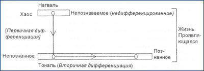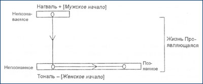 Помимо этого вы должны понять, что само по себе дифференцированное сознание, или тональ, обладает двумя полюсами, а именно — непознанным и познанным. Мы уже знаем: цель проявлениязаключается в том, чтобы дать жизни возможность обнаружить то, что она ещё не знает о себе, и отделить уже познанное от непознанного. Исходя из этого, можно убедиться в том, что познанное является положительным по отношению к непознанному, или, говоря иначе, познанное является мужским, тогда как непознанное — женским. Между двумя полюсами нагваляи тоналянаходится то, что мы называем проявлениемили, точнее говоря, проявлением потенциальной разумности. С другой стороны, то, что существует между полюсами тоналя, безусловно, является дифференцированным сознанием, созданным посредством акта разумности(см. рис. 9).