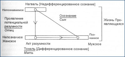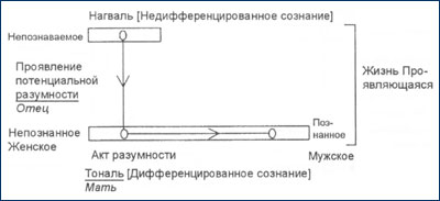 Исходя из того, что первичная дифференциация является причиной вторичной, и применяя описанные выше принципы, мы можем убедиться, что акт разумности отрицателен по отношению к проявлению разумности. Из этого нетрудно сделать вывод, что если бы мы рассматривали два полюса тоналякак единое целое, значит, таким же целым нам пришлось бы считать и первичную дифференциацию между нагвалеми тоналем. Другими словами, если тональ, или дифференцированное сознание, воплощает материнский аспект жизни, то проявление потенциальной разумности — отцовский (рис. 10).