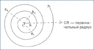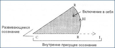 Линейная прогрессия внутреннего осознания (CI), направленная по дуге RI с относительно фиксированным радиусом CR развивающегося осознания.