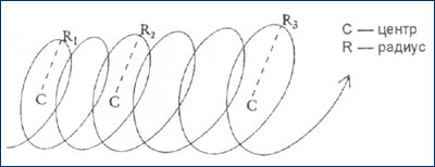 Более того: несмотря на то, что радиус развивающегося осознания неподвижно закреплён в его центре, сам центр не закреплён в жёстко фиксированной точке — наоборот, он постоянно, изо дня в день на протяжении всей жизни воина движется вперёд, подчиняясь линейному движению внутренне присущего осознания. Поэтому спираль оказывается не плоской, а скорее объёмной (рис. 13б).