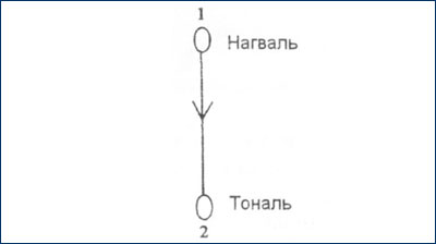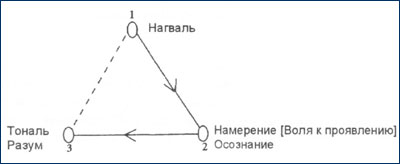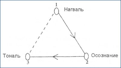 Теперь обратимся к рис. 19. Для того чтобы объединить познанноеи непознанное, нагваль(1), очевидно, должен вначале отделить их друг от друга; но поскольку функция разделения присуща разуму, нетрудно понять, что именно разум является причиной множественности, которую мы называем тоналем(3). Следовательно, мы можем сказать, что разум тождествен тоналю. С другой стороны, намерение(2) является выражением воли нагваля к Проявлениюи потому не только обозначает единство, но и является причиной выполняемого разумом разделения. Следовательно, мы можем убедиться в том, что намерениепрежде всего отвечает за единство и только во вторую очередь — за разделение; таким образом, намерениеявляется истинным отражением двойственности осознания, проявляющейся в качествах разделения и объединения. В результате мы можем поставить знак равенства между намерениеми осознанием.