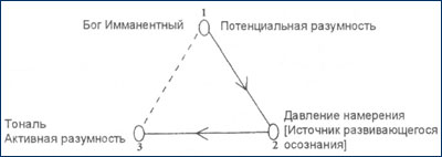 Частица Бога Трансцендентного при этом превратилась в Имманентного (внутренне присущего — прим. перев.) Бога — но не будем забывать, что эта частица, этот щуп внутренне присущего осознанияпредставляет собой только один полюс этой всеобщности, а именно разума. Поскольку предназначение осознания состоит не только в разделении, но и в объединении, намерение, это объединяющее начало, снова оказывает давление на свой противоположный полюс, т. е. на разум. Это и есть второй акт созидания, который вынуждает потенциальный разум, Бога Имманентного, осознать свою незавершённость. В результате потенциальный разум начинает сновидеть всеобщность своей сущности. В процессе этого акта сновиденияпотенциальный разум становится активным разумом (потому что сновидениев основном является действием). Здесь целесообразно снова отметить, что осознание предшествует разделению; но это осознание оказывается не чем иным, как давлением намерения, направленным на объединение. Впрочем, на основании этого можно логически заключить, что происхождение развивающегося сознания объясняется давлением намерения(рис. 20).
