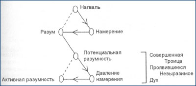 Итак, мы разобрались с первым уровнем Проявления и выяснили, что это первичное Проявление представляет собой точное отражение Святой Троицы (Бог Трансцендентный действительно превращается в Бога Имманентного). Потенциальная разумность отражает нагваль— великую пустоту, воплощающую потенциальность Всего Сущего. Давление намеренияоказывается чистым выражением намерения, а активная разумность — очень ясным выражением разума. Очевидно, что давление намерения(развивающееся осознание) и активный разум ( тональ) являются двумя полюсами осознания, свойственного потенциальной разумности (рис. 20).
