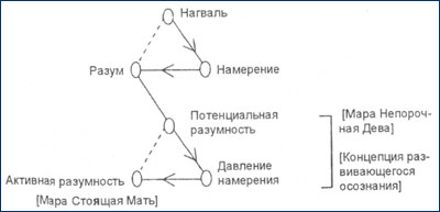 Однако Мара, как и всякая женщина, обладает двумя аспектами, и потому нам необходимо помнить, что потенциальная разумность является продолжением разума в Проявлении и потому он женский по отношению к разуму. По отношению к нагвалюпотенциальный разум выступает прародителем Мары — вот почему Толтеки называют Мару Марой Непорочной Девой, лучащейся женщиной, чистой и незапятнанной в своём сновидении о божественном идеале. Но затем намерениеоказывает давление на разум, чтобы побудить его к объединению, и в результате разум внедряет в потенциальный разум желание завершения, чтобы довести до конца процесс Проявления. При этом Мара Непорочная Дева оплодотворяется мужским партнёром — третьим аспектом Святой Троицы, который христиане называют Духом Святым. При этом, благодаря давлению намерения, потенциальная разумность (женщина) превращается в разумность активную, или второй аспект Мары, который в христианстве называется Матерью с младенцем. Иначе говоря, активная разумность (космический тональ) несёт в своём чреве зародыш развивающегося осознания (рис. 21б).