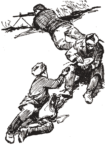 Зажмурившись, он подымается по склону, выволакивая из грязи пудовые сапоги, и не замечает, что одна пола шинели выпросталась из-за пояса, тонет в грязи, тянет его назад. Шатаясь из стороны в сторону, он идет, как слепой, не к своему окопчику, а куда-то в сторону.