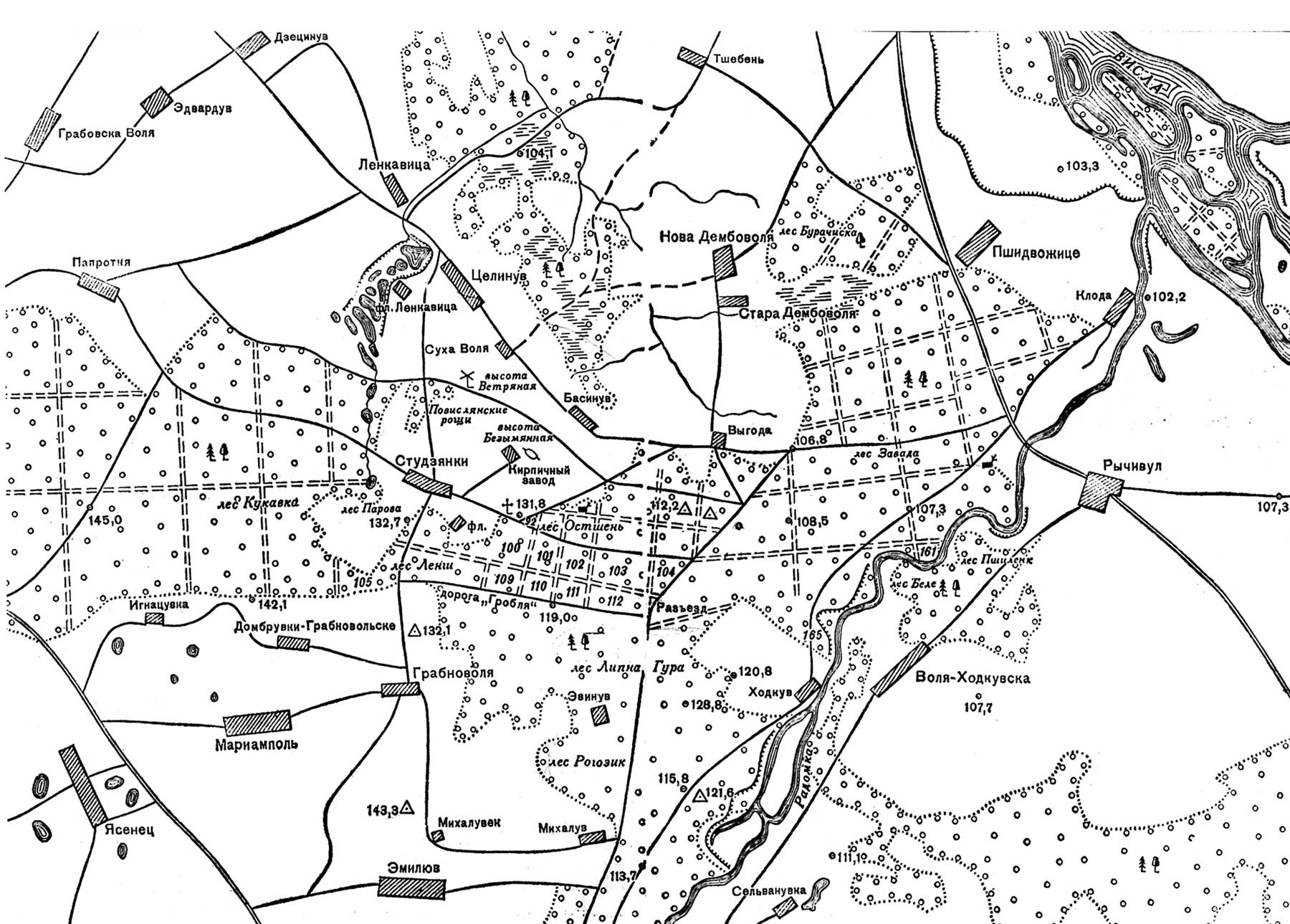 22.30 — Две роты 174-го гвардейского полка, поддержанные 2-й ротой 1-го танкового полка, атакуют Ходкув, отброшены контратакой противника.