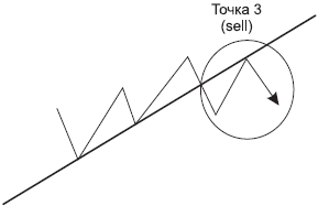 Именно в этом диапазоне цена разрисовывает нам разворот. Как этот разворот выглядит на графике? Итак, цена, пробив линию восходящего тренда, чаще всего возвращается к этой линии. Подобный разворот некоторые называют обратной петлей, другие – подходом с обратной стороны, третьи – «зигзагом». Но неважно, как его называть, важно, что эта точка – замечательный сигнал разворота рынка (точка 3, рис. 4.3). Точка 3 – продажа от контртренда.