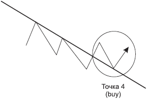 При нисходящем движении на цену «давит» сверху линия сопротивления. Когда цена ее пробивает и несколько периодов закрывает над ней, а затем возвращается к своей бывшей линии сопротивления уже как к линии поддержки, разрисовывая разворот тренда наверх, это и является для нас сигналом на вход в сделку на покупку от контртренда (рис. 4.4). Точка 4 – покупка от контртренда.