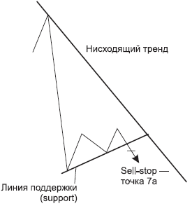 РИС. 4.7.Точка 7а – при нисходящем движении, если цена пробивает линию поддержки, она ускоренно падает вниз