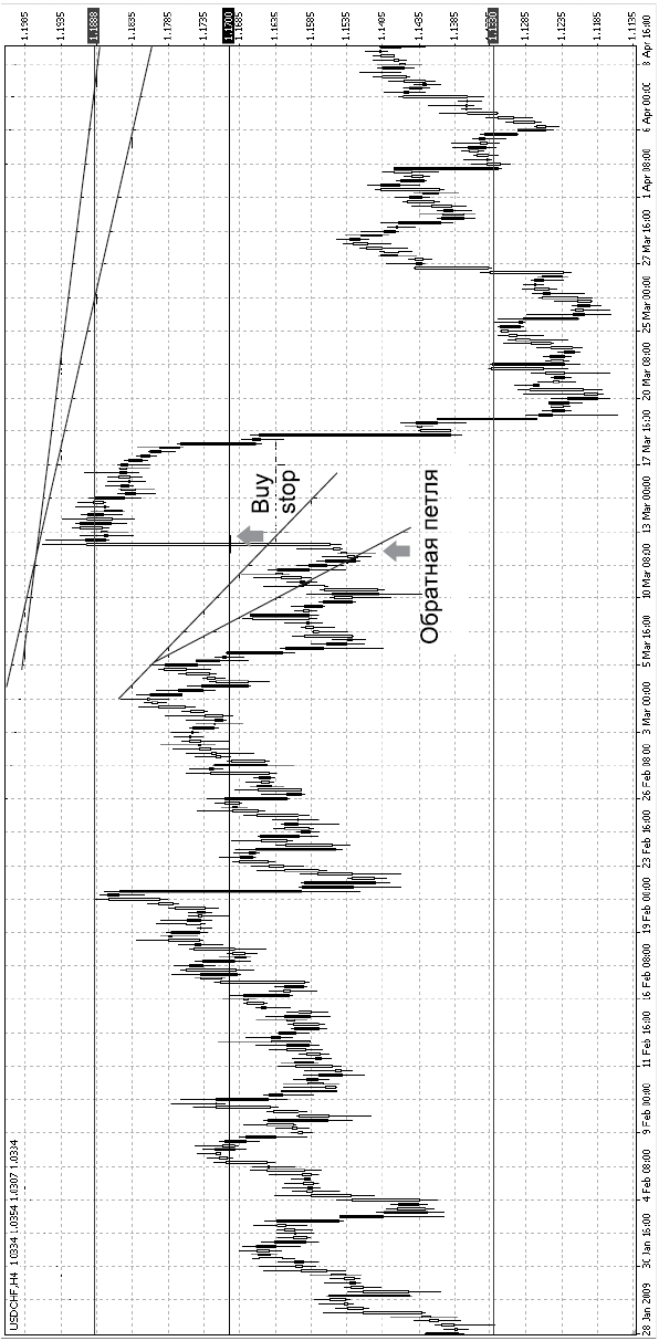 Помните 12 марта 2009 года? Швейцарский банк провел интервенцию. Это непрогнозируемое событие... Подобные события, конечно, редки, но падение франка привело к тому, что доллар резко вырос. И тот, кто не использовал «ограничитель потерь», получил убытки, а тот, кто выставил этот ордер, пусть и зафиксировал небольшие потери, сумел компенсировать их, выставив ордер на пробитие линии сопротивления от 1,1700 и получив прибыль в 3000 долларов (рис. 5.1). И обратите внимание на то, что хотя это и было непрогнозируемое событие, но цена заранее разрисовала разворот в виде так называемой «обратной петли». И это лишний раз доказывает, что цена в своем движении учитывает все прогнозируемые и непрогнозируемые события и часто заранее подает нам сигнал о том, что необходимо делать.
