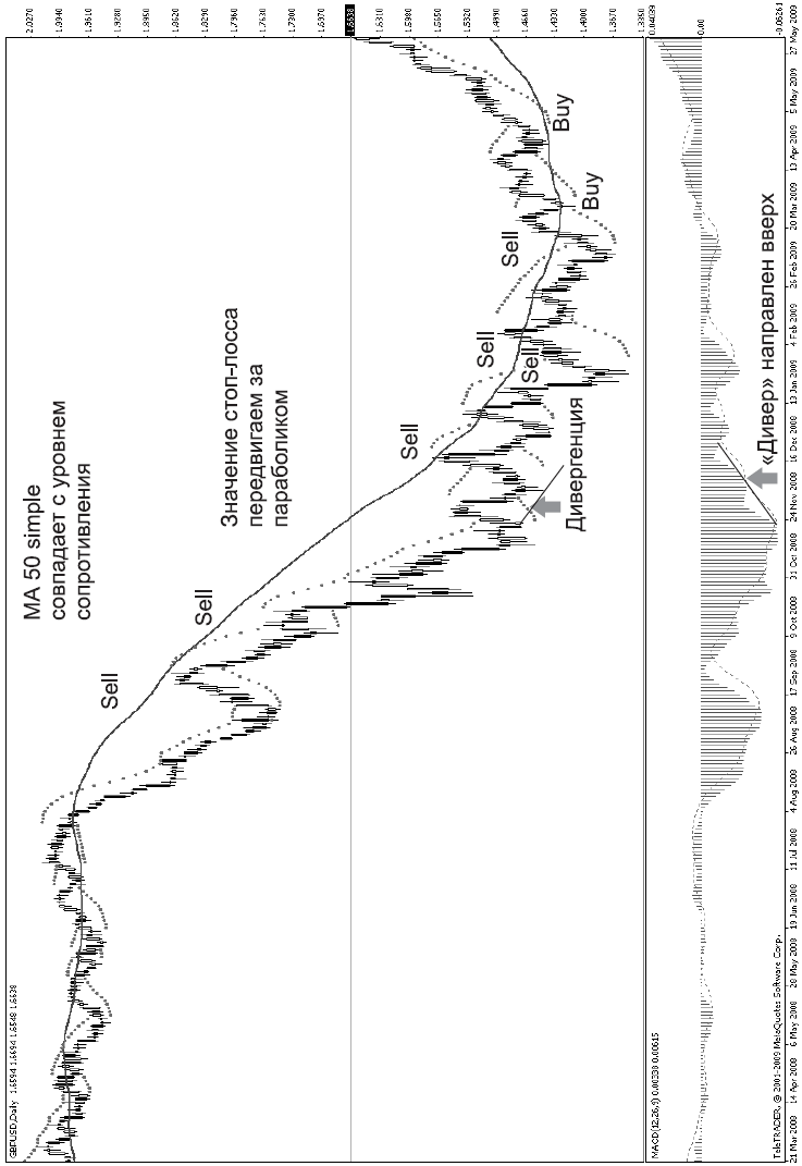 Период скользящих средних определяется опытным путем по истории движения валюты. Для каждого временного периода и каждой валютной пары необходимо подбирать свой период скользящих средних (рис. 9.1).