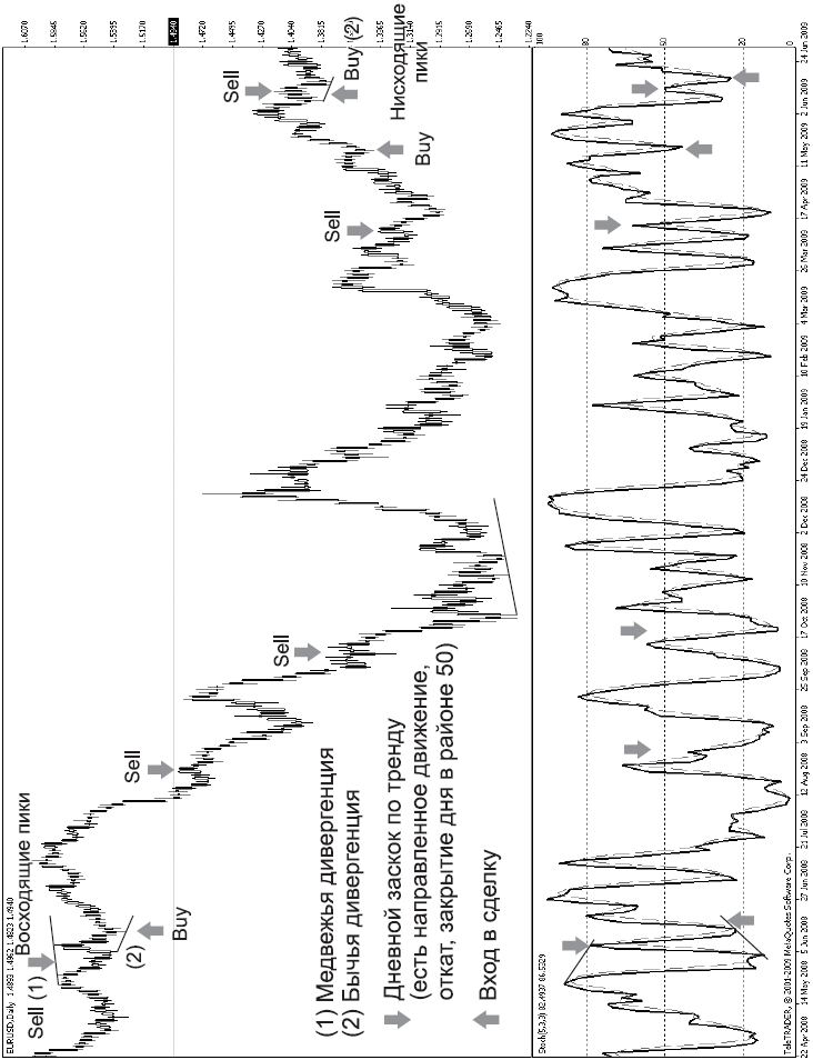 При подъеме рынок стремится закрыться вблизи верхнего края тренда. Если быки могут поднять цены в течение периода, но не могут закрыть их вблизи максимума, стохастические линии начинают убывать. Это дает сигнал на продажу. То же верно и при покупке.