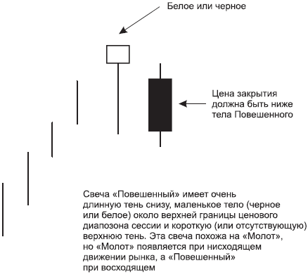 Свеча «Повешенный» – это сигнал разворота на вершине,который должен появиться во время подъема.Ввести в заблуждение может длинная нижняя тень свечи, которая, казалось бы, говорит об активности покупателей, но столь сильное падение в ходе сессии демонстрирует неустойчивость рынка. Малое тело «Повешенного» свидетельствует о том, что восходящая тенденция, на вершине которой появилась эта модель, возможно, находится на переломе. Важный сигнал на разворот рынка вниз – появление следующей медвежьей свечи, особенно если эта медвежья свеча закрылась ниже тела «Повешенного», подтвердив свое намерение идти вниз (рис. 10.13). Если же такого сигнала не последовало и рынок закрыл следующую сессию выше тела «Повешенного», то мы не можем рассматривать эту модель как сигнал на продажу (рис. 10.14).