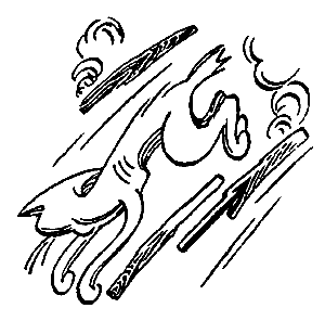Когда Котя начинал шевелиться, переворачиваясь на другой бок, коты останавливались и выжидали. Они подходили всё ближе и ближе и громко мурлыкали. Вот они уже совсем подошли ко входу в шалаш. Но как раз в это время подул ветер. Он выхватил из костра несколько красных угольков и помчались на котов. Котя отпрянули назад.