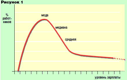— Да, примерно так. Но надо иметь в виду, что это — суммарная величина. Если взять распределение заработной платы по группам работников, то, как видно, разница между низкой зарплатой и средней зарплатой составляет около 15 тыс. руб., а между средней и высокой заработной платой эта разница измеряется десятками тысяч рублей. И поэтому высокие заработки у части работников тянут среднюю зарплату вверх. Грубо: до уровня средней зарплаты ее получает 2/3 работников, а выше — 1/3. Поэтому более представительный показатель — медианная зарплата, ниже и выше которой получает половина работников: она намного ниже средней — где-то в районе 400 долл. Если же взять самую распространенную заработную плату, которую получает больше всего работников (мода — модальная зарплата), то она будет в районе 250 долл. Это видно на графике (см. рис. 1).