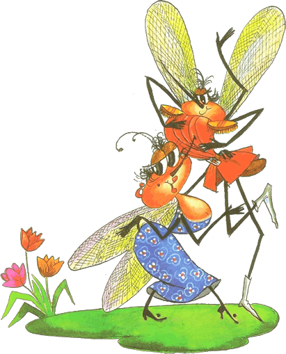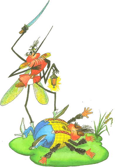 А злодей-то не шутит,Руки-ноги он Мухе веревками крутит,Зубы острые в самое сердце вонзаетИ кровь у нее выпивает.Муха криком кричит, Надрывается,А злодей молчит, Ухмыляется.Вдруг откуда-то летитМаленький Комарик,И в руке его горитМаленький фонарик.«Где убийца? Где злодей?Не боюсь его когтей!»