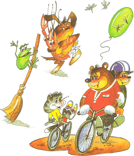 Ехали медведиНа велосипеде.А за ними котЗадом наперед.А за ним комарикиНа воздушном шарике.А за ними ракиНа хромой собаке.Волки на кобыле.Львы в автомобиле.ЗайчикиВ трамвайчике.Жаба на метле…Едут и смеются,Пряники жуют.