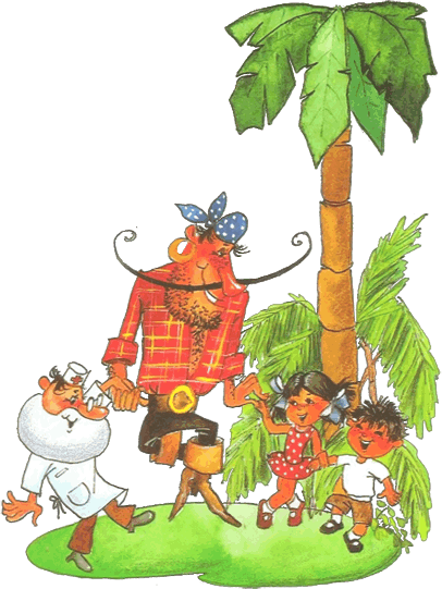 И оттуда, улыбаясь, вылетает Бармалей,И лицо у Бармалея и добрее и милей: «Как я рад, как я рад, Что поеду в Ленинград!»Пляшет, пляшет Бармалей, Бармалей!«Буду, буду я добрей, да, добрей!Напеку я для детей, для детейПирогов и кренделей, кренделей!По базарам, по базарам буду, буду я гулять!Буду даром, буду даром пироги я раздавать,Кренделями, калачами ребятишек угощать.