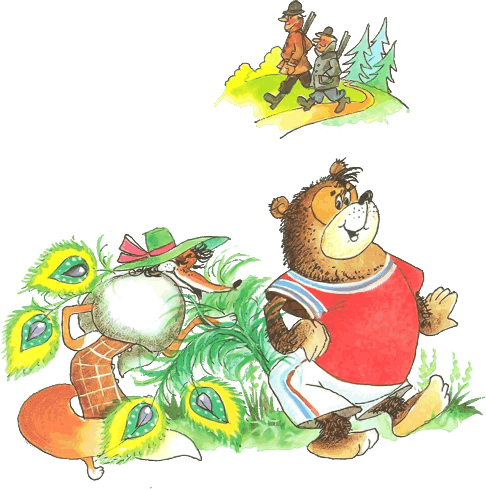 И вот по горам, по долинамМишка шагает павлином,И блестит у него за спинойЗолотой-золотой,Расписной,Синий-синийПавлинийХвост.А Лисица, а ЛисицаИ юлит, и суетится,Вокруг Мишеньки похаживает,Ему перышки поглаживает: «До чего же ты хорош, Так павлином и плывешь! Я тебя и не признала, За павлина принимала. Ах, какая красота У павлиньего хвоста!»