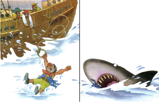 Один пират упал за борт в море. И тут его заметила акула. Подплыла и грозит: «Отдавай тельняшку, или я тебя немедленно проглочу!» А сама — страшная. И каждый зуб у неё — не хуже пиратского ножа. Даже, может, и острей.