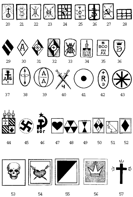 9. «Отрицало», или «Отрицала». Обладатель этого рисунка крайне негативно относится к судебно-исполнительному аппарату, а в частности к сотрудникам милиции. Он также не приемлет идею преступников, которые решили сотрудничать с властями или встали на путь исправления. Известно, что в большинстве случаев обладатель такой татуировки занимает высокий ранг в воровском мире. При общении с «отрицалами» следует свести к минимуму разговоры о правоохранительных органах, избегать конфликтов и разговоров на личные темы.