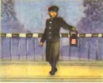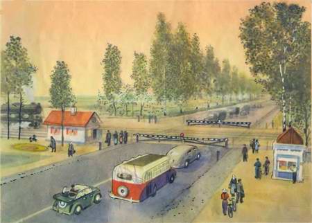 Когда приближается поезд, сторож опускает длинную полосатую перекладину через весь переезд, и все машины останавливаются. Называется эта перекладина «шлагбаум». А ночью сторож встречает поезд с фонарём.