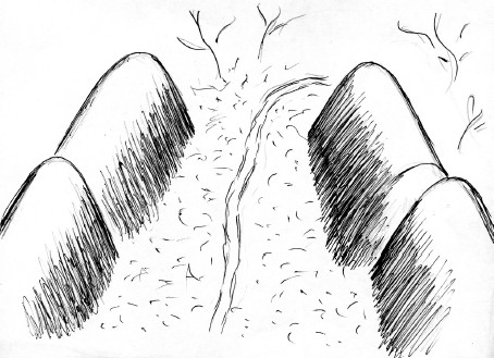 А вот другой пример возможного осмысления вершины горы как ландшафтного святилища, обследованного автором этой книги в 2000 году. Одна из старинных дорог Кольского полуострова пересекает долину реки Лувеньги (название древнее и ныне непереводимое) и ведет к горе Акатьевской. Когда идешь к ней от Кандалакши, почти точно на восток, оставив позади знаменитый Кандалакшский лабиринт, — гора высится впереди, и явственно видно ущелье, рассекающее ее вершину как гигантский визир. Дорога сориентирована именно на него…