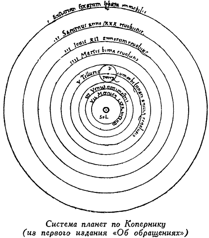 В десятой главе первой книги своего труда Коперник сразу смещает Землю с ее центральной мировой позиции; он в центре мира ставит Солнце, а Землю превращает в шаровидное тело, двигающееся вокруг «светоча мира — Солнца». Это нарушение вековых традиций было уже подлинно революционным актом, подлинной революцией в астрономии.