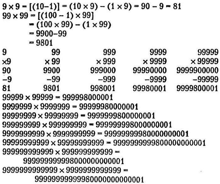 Я исписал все листки, и тут выяснилось, что я единственный в классе, кто успел дойти до 9, а потому я решил заняться умножением. Чтобы в сложении что-то получить, нужно затратить уйму времени, особенно если не складывать большие числа, а у нас в задании все числа были очень маленькие. И вот я стал умножать 99 х 99 и 199 х 199 и еще несколько интересных чисел. Мне нравятся числа, которые с виду похожи на другие.