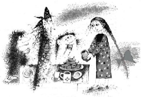 Взяла муку сеять, а за сито никак не ухватиться, само туда-сюда ходит. Ковшик уж за водой слетал, яичко над мукой разломилось, солонка посолила, сахарница посахарила. Даша руку мукой не запудрила.