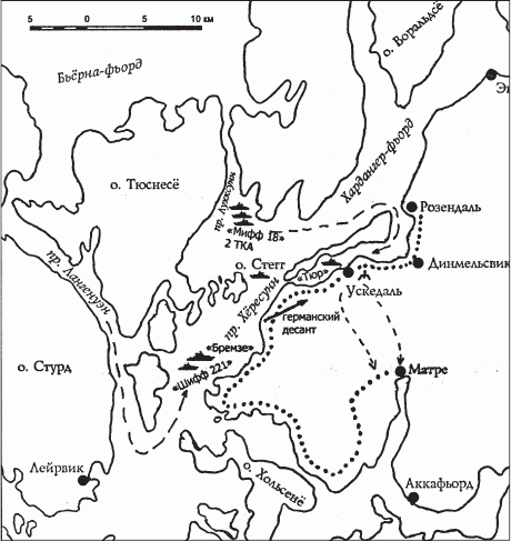 Одно попадание в носовую часть получил «Бремзе», но это не сказалось на его боеспособности. К счастью для немцев, торпедная батарея «Кварвена» молчала.