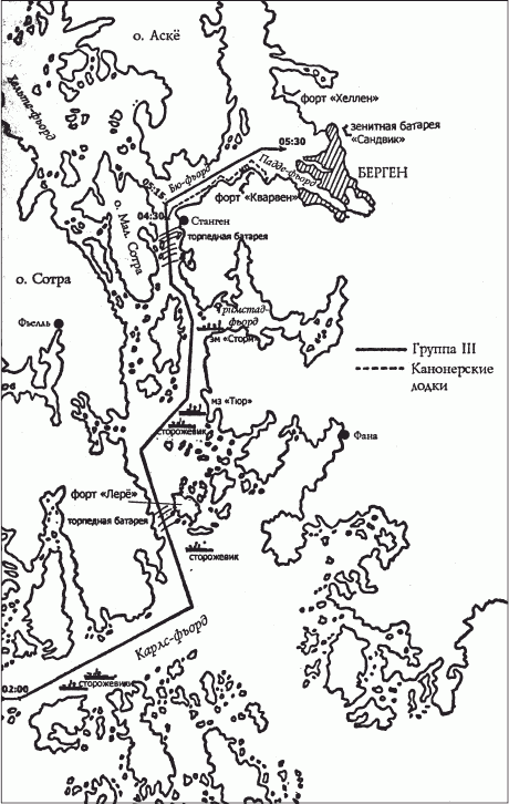В Бергене стояли ремонтировавшиеся корабли: миноносец «Бранд», минный заградитель «Уллер», а также выведенный из состава флота миноносец «Хваль». Севернее, у авиастанции Флатё, стоял 2-й дивизион тральщиков. Подводная лодка В-6 и миноносец «Снёгг» находились во Флурё, миноносец «Трюгг» — в Олесунне, миноносец «Стегг» — в Скудеснесе. Южные входы в Бю-фьорд охраняли сторожевые корабли «Мангер», «Хаус», «Линдаас», миноносцы «Сторм» и «Сэль». В северных проливах дозор несли сторожевики «Бьерк», «Коммонвелт», «Веслефрикк» и «Веслегутт».
