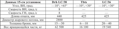 В башне Drh LC/38 оба орудия помещались в общей люльке. Угол вертикального наведения —10°; +65° давал определенные возможности для зенитной стрельбы, хотя приводы действовали довольно медленно для слежения за самолетом. По данным Гренера, угол вертикального наведения у всех 15-см установок, как одиночных, так и двухорудийных, — 19°; +47°.