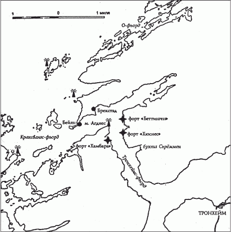 С непотушенными огнями, предупреждая по-английски норвежцев об отсутствии опасности, «Хиппер» с эсминцами вошли в Тронхеймс-фьорд. Его наиболее узкая часть ярко освещалась прожекторами, что говорило о том, что наблюдательные посты и береговые батареи получили предупреждение об опасности. В 4 часа утра германский отряд прошел мыс Агденес, а через 12 минут батареи «Хюснеса» открыли огонь. Первые три выстрела легли с недолетами. В ответ Хейе приказал ослеплять наводчиков светом прожекторов и, лишь пройдя мимо форта, дать пару залпов из кормовых 20,3-см башен.