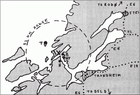 Схема расположения батареи «Орландет» и других батарей в районе Тронхейма: Х — батарея «Орландет»; Т — батарея «Тарва»; В — форт «Бреттинген»; HY — форт «Хиснес»; Н — форт «Хамбара»