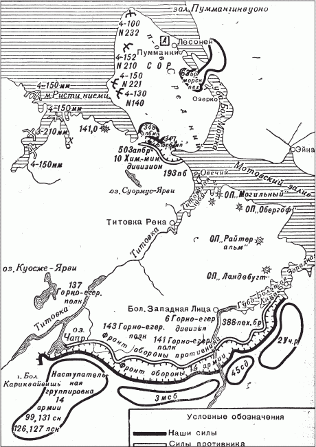 В 10 ч 50 мин 22 июня 1941 г. немецкий горный корпус в составе 2-й и 3-й горных дивизий начал выдвижение к советской границе по территории Финляндии. С юга германские дивизии охранял финский егерский пограничный отряд численностью около 1500 человек.