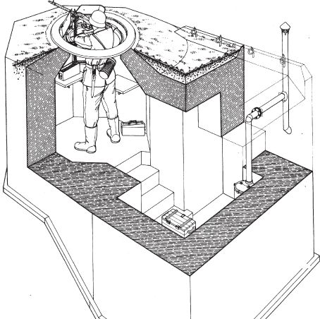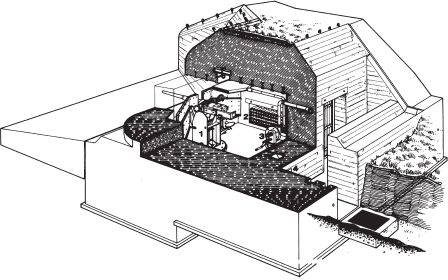 Бункер Атлантического вала. Стандартная позиция для 5-см танкового орудия. Здесь находятся: 5-см орудие на крепостной опоре; готовые боеприпасы; ручной вентилятор; удаление израсходованных гильз