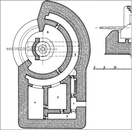 1 — вход; 2 — газовый шлюз; 3 — хранилище снарядов; 4 — склад снарядов и пороховых зарядов; 5 — коридор для транспортировки боеприпасов; 6 — орудийная позиция