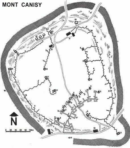 Батарея «Мон Канизи»представляла собой небольшой укрепленный район. Его вооружение состояло из четырех 10,5-см французских пушек K.420(f), три из которых были помещены в каземате типа 679, а одна стояла открыто [34] . Кроме того, на позиции находилось шесть 10,5-см французских гаубиц F.H.325(f), одна 7,62-см советская трофейная пушка УСВ, а также несколько 5-см и 2-см германских зенитных автоматов, одна 5-см башня с танковой пушкой 5 cm KwK и 2–3 бункера «тобрук» с 3,7-см башнями от французских танков R-35.