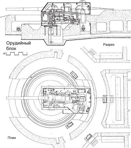 Башенная установка 30,5-см пушки K.14(r) батареи «Мирус» (разрез и план)