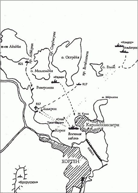 Теперь дошла очередь и до миноносцев. Головной «Альбатрос» стал медленно обходить остров Велё. Обнаружив еще два вражеских корабля, старший артиллерист «Трюггвасона» лейтенант Брааруд приказал взять их на прицел. На заградителе шел ремонт машин, и он не сразу смог развить ход, но орудия вели огонь точно. На «Альбатросе» не могли понять, откуда на них падают снаряды. А когда обнаружили противника, то стрелять по нему могло только одно 10,5 см носовое орудие. Тогда командир «Альбатроса» задним ходом вывел корабль из-под обстрела. Идущий за ним «Кондор» описал широкую циркуляцию и скрылся в тумане. Оба миноносца присоединились к основным силам группы в Сун-бухте.