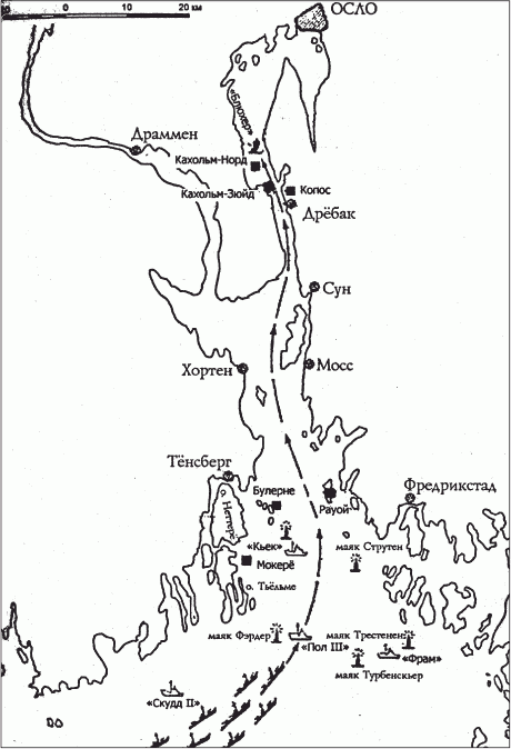 Между тем 9 апреля в 9 ч 30 мин король Хокон VII вместе с сыном — наследным принцем Улафом и прочими высочайшими особами бежали из Осло в направлении города Хамера. Вместе с ними убежала и часть министров и депутатов парламента. Одновременно из Осло выехали двадцать грузовиков, нагруженных золотом из подвалов национального банка Норвегии, и еще три грузовика с секретными документами министерства иностранных дел.