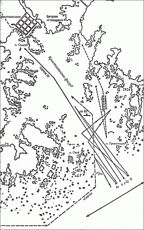 Как уже говорилось, береговая крепость «Кристиансанн» состояла из шести батарей, вооруженных 15 орудиями 150–240-мм калибра. Самыми опасными для германских кораблей являлись батареи лежащего прямо перед портом острова Оддерё, обойти который было нельзя. В 2,5 км на северо-восток находилась батарея «Глеодден».