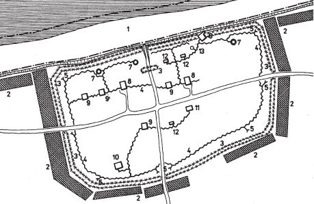 1 — заградительная противодесантная полоса; 2 — минное поле; 3 — противопехотные заграждения из колючей проволоки; 4 — траншеи; 5 — полевые пулеметные позиции; 6 — артиллерийские бункеры; 7 — открытая платформа для противотанкового и противокорабельного орудия; 8 — бункер для боеприпасов; 9 — бункер для отделения; 10 — бункер для отделения; 11 — радарный бункер; 12 — «торбук» для миномета и пулемета; 13 — «торбук» для башни танка «Рено» с 3,7-см орудием