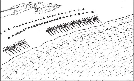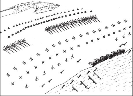 Немцы хорошо использовали характер местности при планировании своей обороны. Вся отмель, образуемая при отливе, была усеяна противодесантными заграждениями с минами всех сортов. На галечной насыпи было установлено заграждение из спиралей колючей проволоки и поставлены мины. Все проходы через дюны были блокированы минами и бетонными заграждениями и противотанковыми рвами. Побережье на этом участке прикрывалось шестнадцатью долговременными огневыми точками в бетонных укрытиях и бункерах, вооружение которых состояло из легкой и противотанковой артиллерии и крупнокалиберных пулеметов. Невидимые с моря огневые позиции немцев, способные держать побережье под перекрестным огнем, были вырублены в скалах на флангах участка.