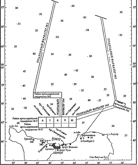 Поэтому союзники решили использовать против защитников Шербура корабельную артиллерию. 25 июня в 4 ч 30 мин из Портленда вышли две группы кораблей. В первую входили тяжелые крейсера «Тускалуза» и «Куинси», линкор «Невада», английские крейсера «Глазго» и «Энтерпрайз», а также шесть эсминцев. Вторая группа включала линкоры «Техас» (флаг командующего группой контр-адмирала Брайанта) и «Арканзас», а также пять эсминцев.