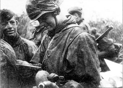 Группа солдат войск СС за получением корреспонденции из тыла. Советско-германский фронт, февраль 1945 года (РГАКФД)