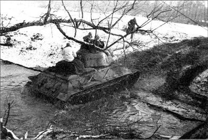 Т-34–76 под командованием младшего лейтенанта В.И. Юхарова (тактический номер «110») направляется к линии фронта. 1-й Белорусский фронт, февраль 1945 года (РГАКФД)