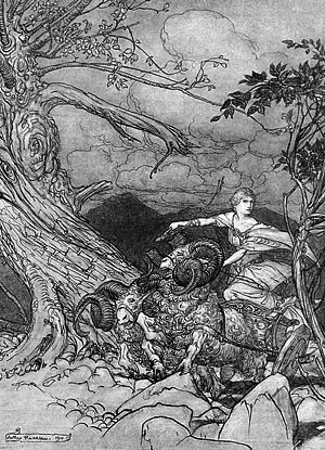 Вотан вздрагивает, делая жест ярости. — Фрика замечает впечатление, произведенное ею на Вотана, и продолжает все с большей и большей уверенностью.